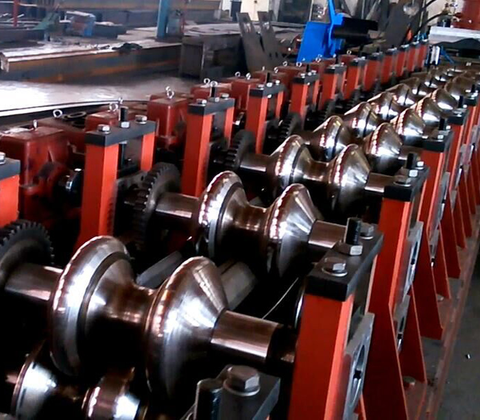 开卷机→导向装置→校直装置→液压机破口装置→卷成型机→液压冲床→剪切装置(含刀)→成品机架